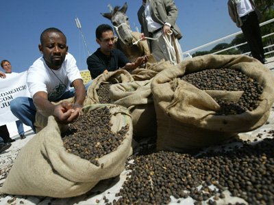 November is the principal gathering month. The work is performed by slaves, and very hard they have to work; for in 1892 they will be free, so the slaveholder's policy is to get as much work as possible from them while he can. From sunrise to sunset, men, women, and children are gathering the berries in baskets, working silently and steadily under the overseer's eye. Every day, each slave gathers, on the average, berries enough to produce fifty pounds of dried coffee. The pickings are collected in carts and brought to the mill-house, where the seeds must be prepared for the market.