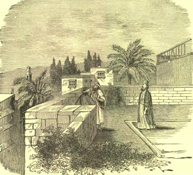 "Town-meetings are held on the house-tops, proclamations are made on the house-tops, and olives, figs, and grapes are here spread out to dry. Before the wheat is ground, it is washed and spread on the housetop, and the children watch it while drying to keep away the sparrows. Here the washed clothes are hung out; and here the women of the households meet and lean over the parapets, either to see what is passing in the street, or to talk with the neighbors. The Mohammedans pray on the housetops, turning their faces toward Mecca.