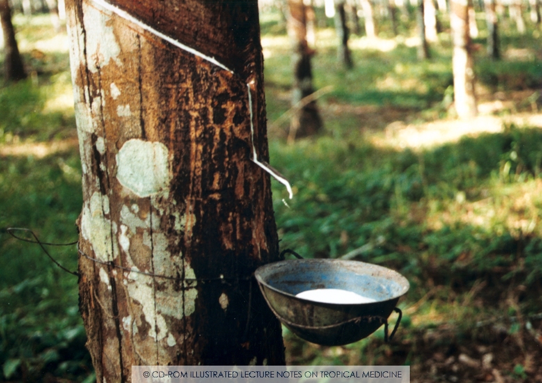 The lower part of the trunk is usually without any branches, the top is spreading, with its beautiful glossy foliage toward the sun. On the slightest incision, the gum exudes, resembling a rich cream. The trees are mostly tapped in the morning, and about a cup of the liquid is procured from one opening in a day. It is first caught in small vessels made out of clay, moulded for the purpose by the hand, and then poured into large jars. It is ready for use as soon as it comes from the tree, and is made into different forms after models formed of clay.