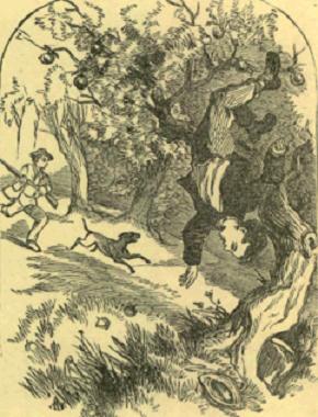 So these ten started out about nine o'clock in the evening, stole around through meadows, leaped stonewalls, and at last reached the orchard. Some climbed the pear-trees, and filled their pockets with the luscious fruit; others sought the rare, ripe apples; others gently disengaged the downy peaches from their tender boughs; while others plucked the tempting grapes. All were busily engaged in this pilfering business, when, hark! A low growl, heavy footsteps, and then a fierce-looking dog, barking furiously, chased vigorously boy after boy as they dropped from the trees and started to run away; and following close behind was the farmer with a long club.