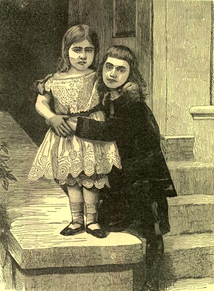 Slowly sank the sun, lower and lower, and the day was almost done. "Ah!" finally broke from his lips, as we came into the suburbs of Niceville, "there they are!" I looked, and there was indeed a picture to gladden the eyes of any parent. A tiny girl, in white dress, and with long golden curls, stood on the broad stone step, while a boy some years older stood with his arms around her, both eagerly looking for papa.