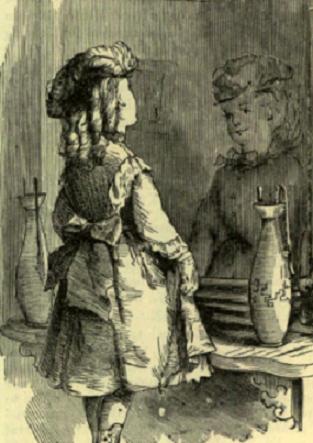 MISS VANITY is very prettily arrayed in her white dress, gaiter-boots, and jockey hat, with its graceful feather, beneath which flows her wealth of curls. And there she stands upon a chair, before the large mirror on the marble slab over the fireplace, with a tall vase on either side of her, while she daintily holds out her dress. Yes, there she stands admiring herself. She seems to be saying, "Well, I am pretty. My cheeks are round and plump; my mouth is real handsome; and my eyes are black as huckleberries, and bright as diamonds; and my hat is just splendid. I don't wonder Mrs. Loveland, when she called this afternoon, told Aunt Susan that I was a sweet child."