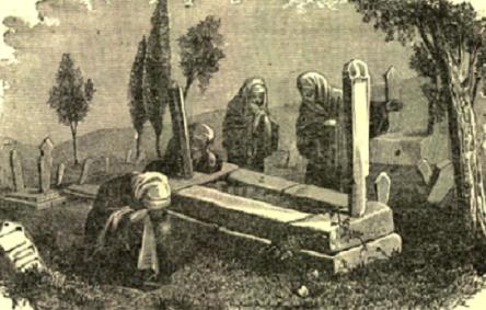 HERE we have a scene in a Turkish burial-ground. To all appearances, a body has recently been deposited in one of the graves, around which the friends of, the deceased have come to weep and mourn. As you behold their expressions of grief, your sympathy is aroused, for it would seem that such agonizing expressions must be caused by the deepest sorrow. But in this we may be mistaken; for we learn that it is the custom in that country for the women of a bereaved house to visit the grave every morning for many weeks after the funeral, and weep over it, whether their sorrow be real or not; and that, when they are not disposed to go themselves, they hire professional mourning women to go and weep for them. Thus showing that it is not always genuine sorrow that causes them to weep, but that often it is for fear they will not be respected by their friends unless they keep up the appearance of great sorrow.