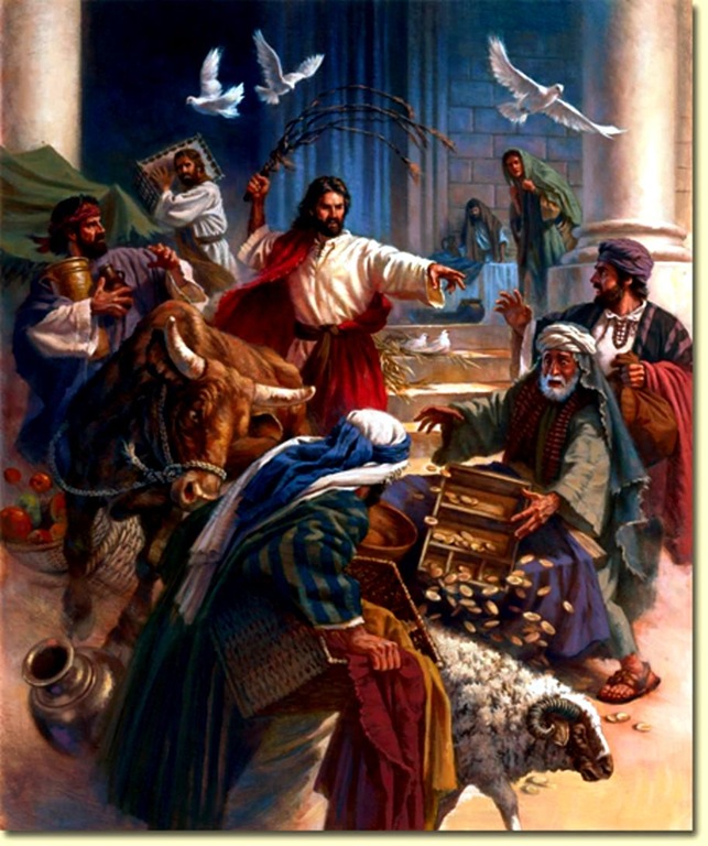 there. And both Jesus was called, and his disciples, to the marriage. And when they wanted wine, the mother of Jesus saith unto him, They have no wine. Jesus saith unto her, Woman, what have I to do with thee? Mine hour is not yet come. His mother saith unto the servants, Whatsoever he saith unto you, do it. And there were set there six water pots of stone, after the manner of the purifying of the Jews, containing two or three firkins apiece. Jesus saith unto them, Fill the water pots with water. And they filled them up to the brim. And he saith unto them, Draw out now, and bear unto the governor of the feast. And they bare it. When the ruler of the feast had tasted the water that was made wine, and knew not whence it was (but the servants which drew the water knew), the governor of the feast called the bridegroom, and saith unto him, Every man at the beginning doth set forth good wine; and when men have well drunk, then that which is worse; but thou hast kept the good wine until now. This beginning of miracles did Jesus in Cana of Galilee, and manifested forth his glory; and his disciples believed on him. After this he went down to Capernaum, he, and his mother, and his brethren, and his disciples; and they continued there not many days." And the Jews' Passover was at hand, and Jesus went up to Jerusalem, and found in the temple those that sold oxen and sheep and doves, and the changers of money sitting; and when he had made a scourge of small cords, he drove them all out of the temple, and the sheep, and the oxen; and poured out the changers' money, and overthrew the tables; and said unto them that sold doves, Take these things hence; make not my Father's house a house of merchandise.
