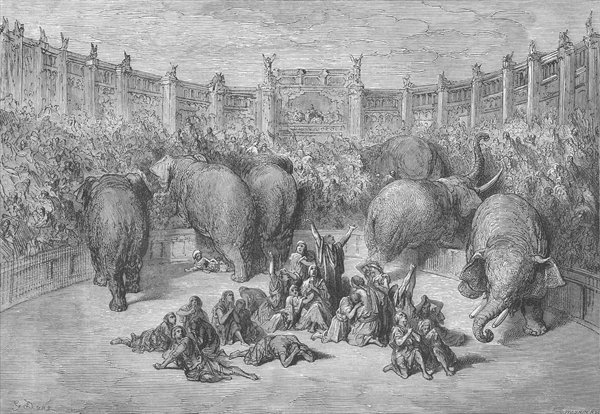 For many years there was fierce contention between Syria and Egypt. At last, about two hundred and seventeen years B. C., a decisive battle was fought near Gaza. Victory turned in favor of Ptolemy Philopater, king of Egypt, and Antiochus the Great was thoroughly conquered. Soon after the battle, Ptolemy visited Jerusalem, and insisted on entering the holy of holies in the temple, in spite of all opposition from the priests. It is said, however, that "when he had got so far as the holy place, he was seized with such confusion and terror that he retreated in dismay." Ptolemy was so enraged at being opposed by the priests that he afterward treated the Jews with great cruelty. At one time he gathered all the Jews that he could find in Egypt, and shutting them up in the hippodrome, let elephants loose upon them; but instead of destroying the Jews, the elephants turned upon those who came to see the show, and killed great numbers of them.