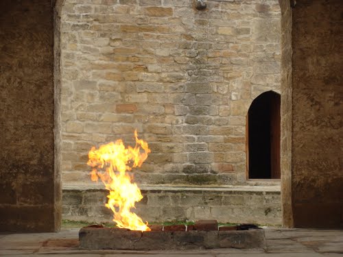 On it there are several ancient temples of stone, supposed to be dedicated to the fire, there being one among them in which fire worship is now carried on. Near the altar is a large hollow cone, from the end of which issues a blue flame. The worshipers affirm that this flame has continued ever since the deluge, and they believe if it were suppressed in that place it would break out in another.