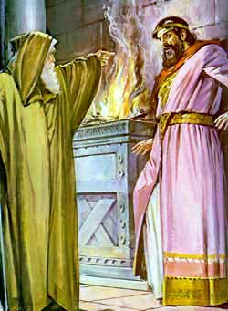 WHEN Saul had reigned two years over Israel, he chose three thousand men to be constantly with him. He kept two thousand with himself in camp at Michmash, and one thousand encamped with Jonathan at Gibeah. Jonathan and his men smote a garrison of the Philistines. This made the Philistines so angry that they gathered a great army, and came up to make war with the Israelites. They had "thirty thousand chariots, and six thousand horsemen, and people as the sand which is on the sea-shore in multitude." At this, the men of Israel were so frightened that they hid themselves in caves, in thickets, in rocks, and in pits; and some of them fled across the Jordan into the land of Gad and Gilead. Saul was in Gilgal, and the few that were with him trembled for fear of the Philistines. Saul waited at Gilgal seven days for Samuel to come down to make an offering unto the Lord; but Samuel did not come, and the people were continually scattering, so Saul, fearing that he would soon be left alone, took the place of a priest, and offered up sacrifices to the Lord. As soon as Saul had finished making the offering, Samuel came; and when Saul went out to meet him, Samuel said, "What hast thou done?" and when Saul told him, he said, "Thou hast done foolishly; thou hast not kept the commandment of the Lord thy God, which he commanded thee; for now would the Lord have established thy kingdom upon Israel forever. But now thy kingdom shall not continue; the Lord hath sought him a man after his own heart, and the Lord hath commanded him to be captain over his people, because thou hast not kept that which the Lord commanded thee." Then Samuel left Saul, and went up to Gibeah.