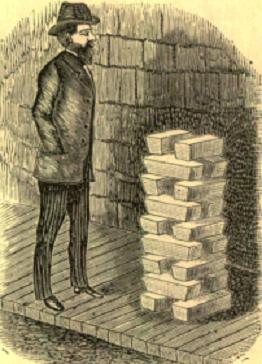 In this operation the quicksilver attracts the silver and amalgamates with it. The pulp is then thinned with water, causing the quicksilver, with the silver adhering to it, to settle to the bottom of the pans. The pulp, or dirt, is allowed to pass off with the water. The silver is then taken out and conveyed to the next room, where the quicksilver is removed from it. It is then placed in the retort, melted, and run into bricks, or bars, as you see in the picture. Each one of these bars is valued at from $1,500 to $1,800. By counting the bars we find that there are eighteen, so that a pile of silver of this size would be valued at about"$30,000.
