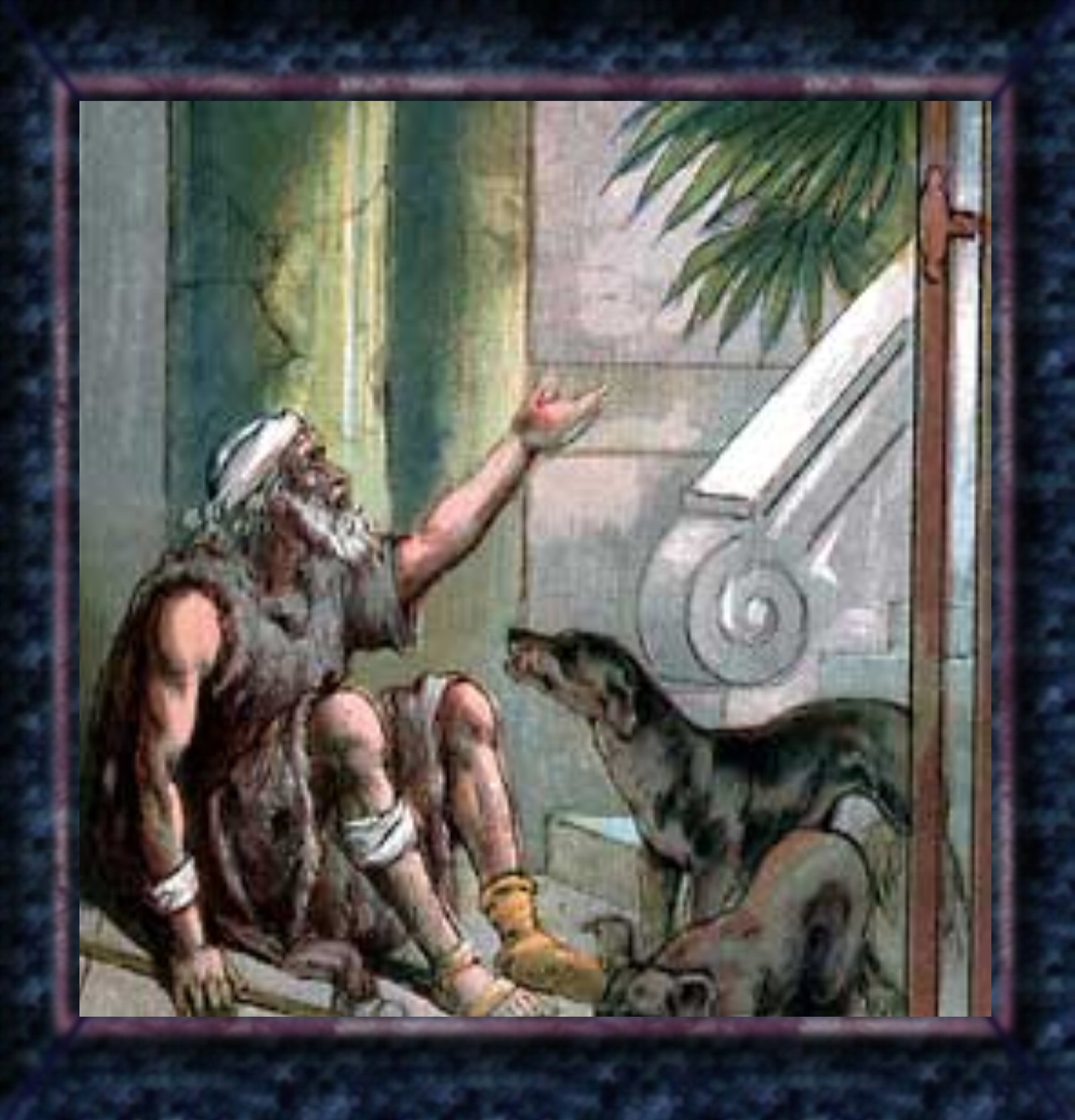 The dogs came and licked his festered limbs. These poor canine creatures showed more real affection than the haughty rich man. Probably this refers to the troops of homeless dogs which have no masters, and which are very numerous in Oriental cities, going in packs.